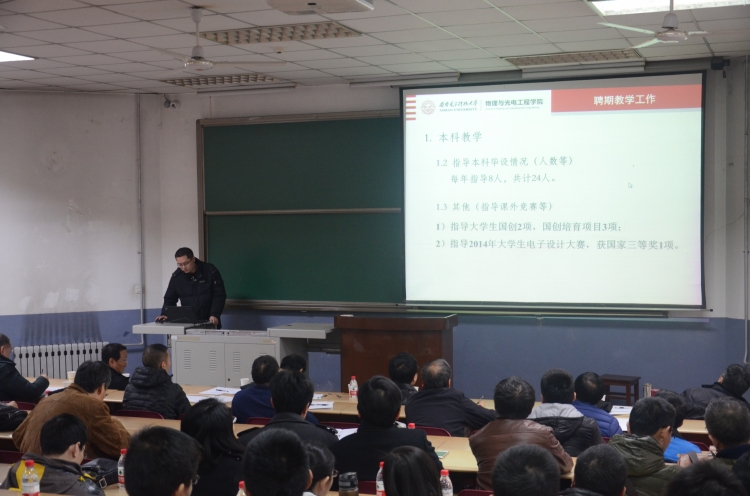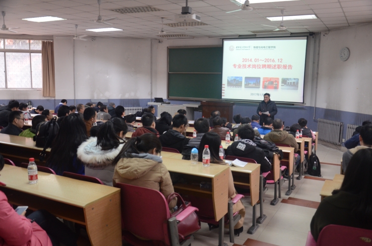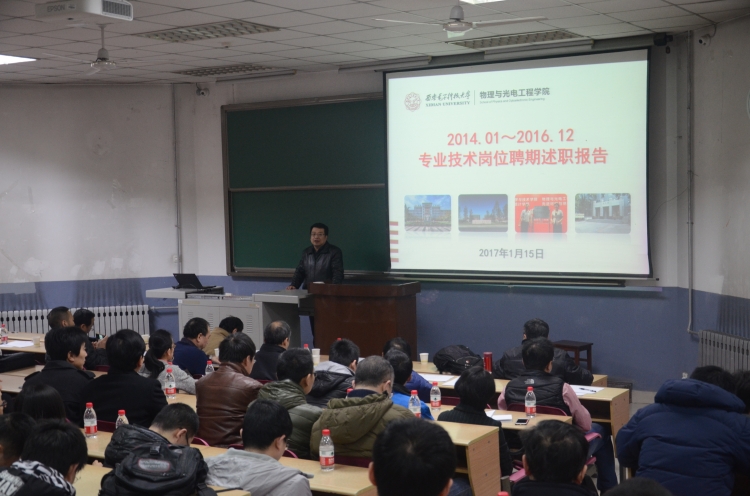 (通讯员 李维嘉)1月15日上午8:00,物理与公司于北校区阶梯教室101举办2016年度青年教师年度暨聘期考核汇报会,公司45周岁以下青年教师对自己本聘期内的各项工作进行总结汇报。公司领导班子、学术委员会成员及各系室主任担任评委,会议由副经理周慧鑫主持。