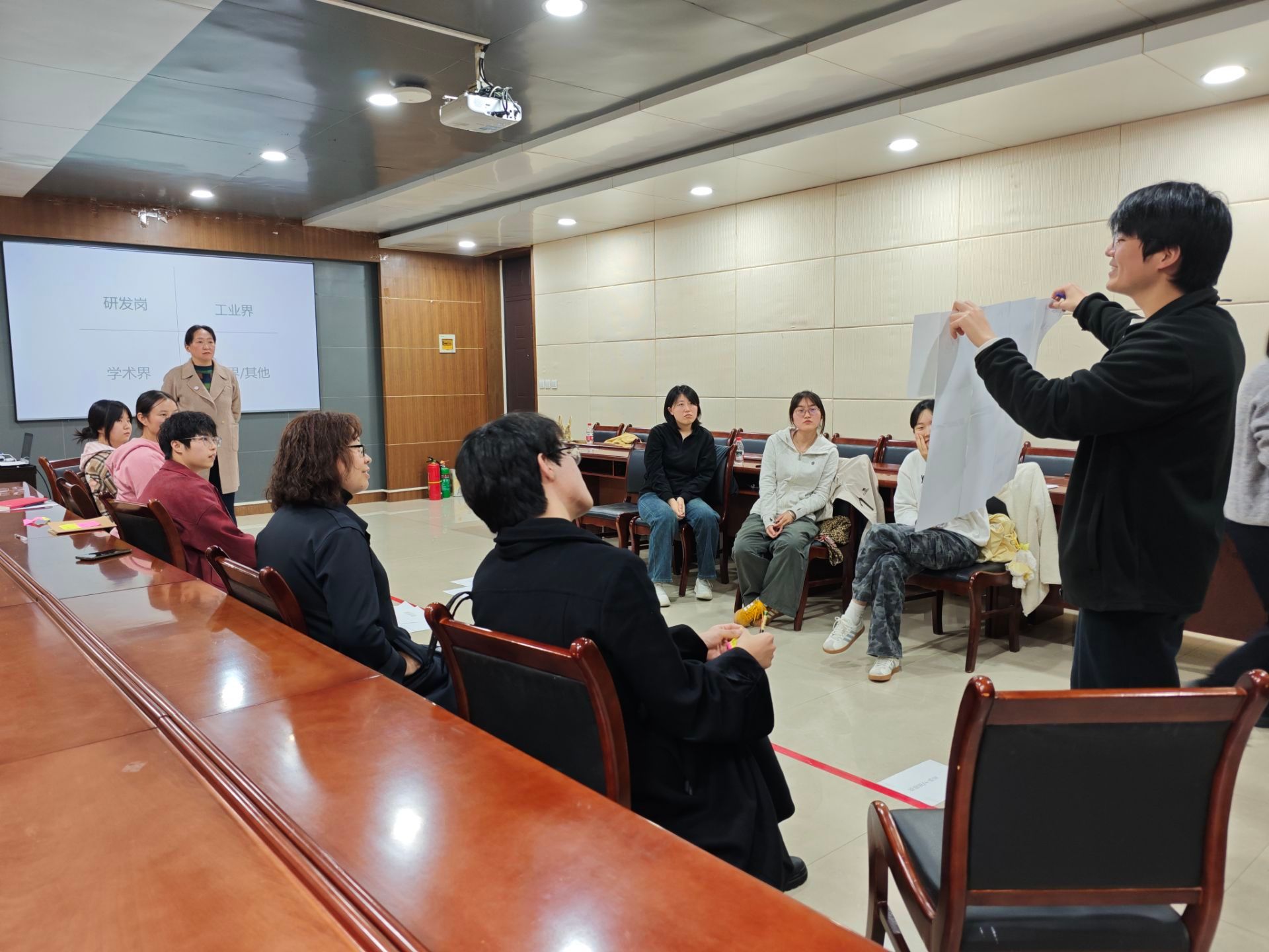 完成个人展示后,大家分为两个小组,每位同学在规定时间内依次分享所选技能、动作含义及站位理由,进一步辨析“擅长”与“热爱”之间的异同,深化自我觉察。随后,活动以“头脑风暴”形式展开对未来就业方向的探讨,现场归纳出研发岗、学术界、工业界等多个职业路径。各小组总结出目标岗位所需的三项核心技能及可能面临的主要挑战,并由小组代表汇报讨论成果。最后,同学们写下自己的年度目标,并明确“下月第一件事”作为启动步骤,将长远愿景落实为具体行动。