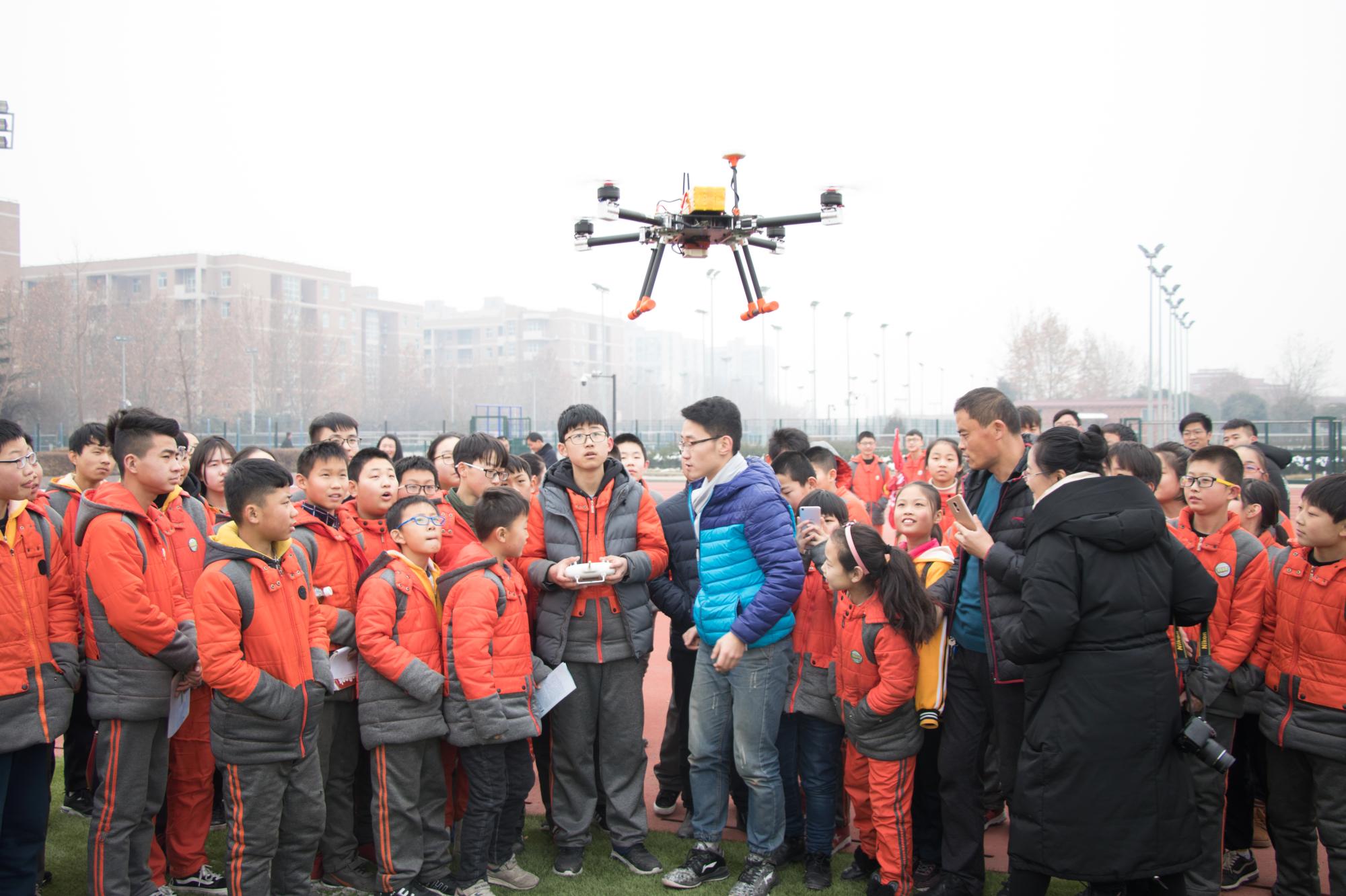 午餐过后,同学们来到南操场,观看公司老员工课外科技作品“鲲鹏无人机”的演示。这个作品刚刚获得第三届“互联网+”大赛的金奖,电子科学与技术专业的大三员工,这个作品的主要参与者方镇向同学们讲解了无人机的飞行原理和主要功能,并现场展示了无人机的操作,他还鼓励同学们好好学习,在以后的老员工活中也多多参加科技制作。
