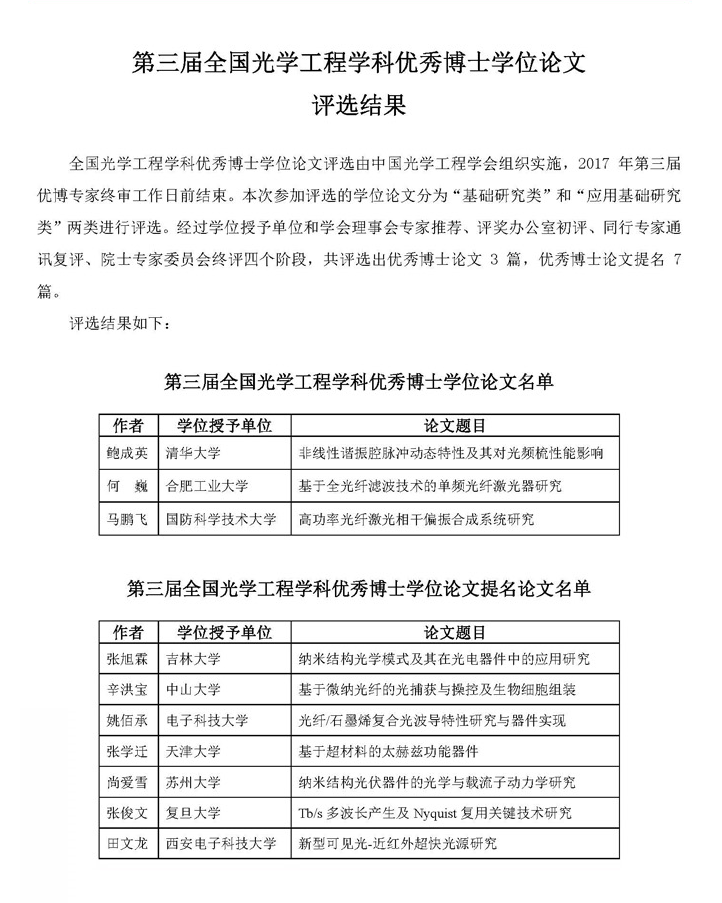 公司田文龙获得第三届全国光学工程学科优秀博士学位论文提名奖