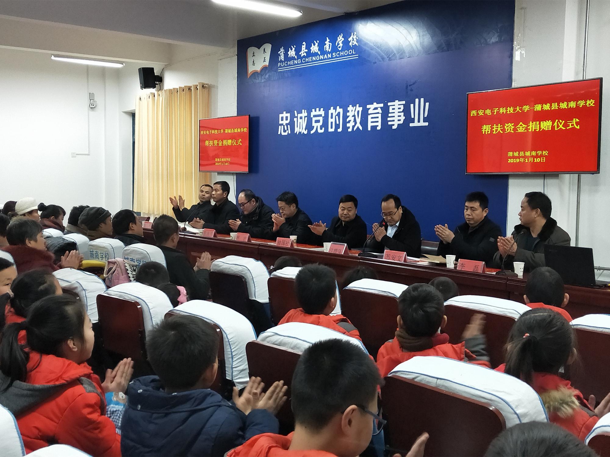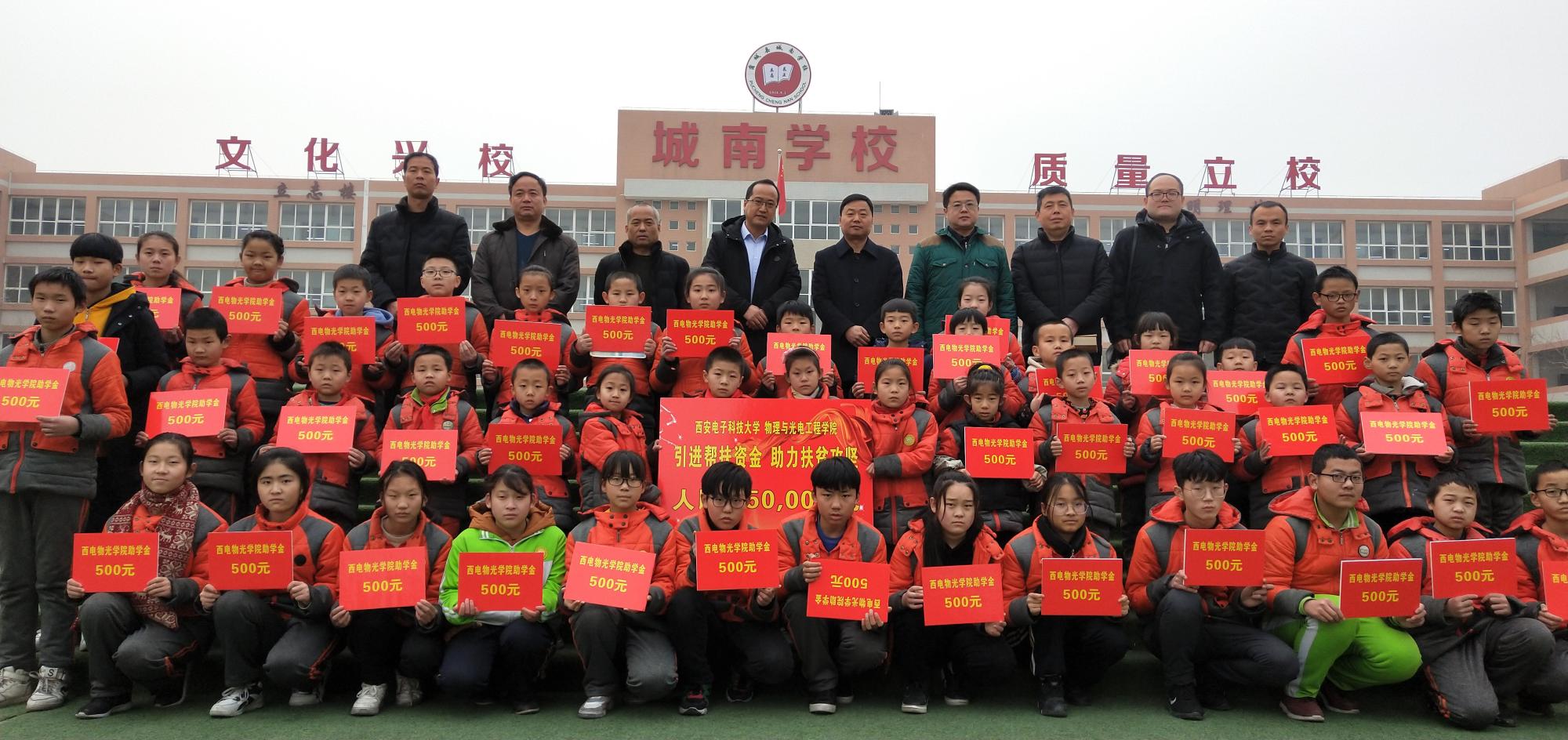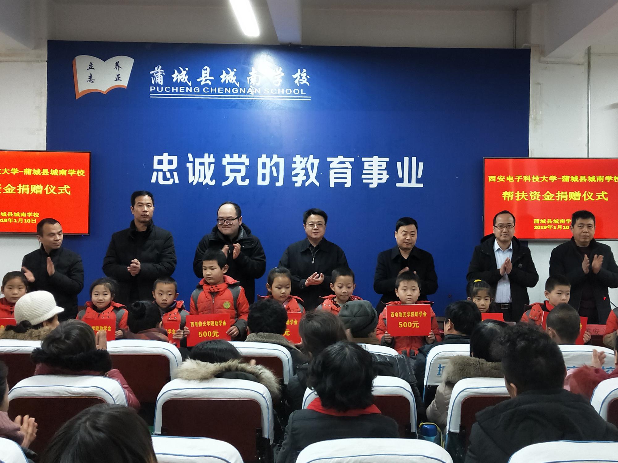 捐赠仪式上,独国社在讲话中谈到,公司充分发挥高校在国家脱贫攻坚工作中的特殊优势作用,将“扶贫”与“扶智”、“扶志”相结合,多次向蒲城县城南公司捐赠课外书籍、文体用具、科创工具,开展对接洽谈、志愿授课、科技讲堂等各类扶贫对接活动多次,建立了蒲城县城南公司“英国正版365官方网站老员工志愿服务基地”、“英国正版365官方网站物理与英国上市公司365老员工实践基地”,援建“西电物光院-蒲城城南公司员工科技活动室”,并邀请城南公司师生来公司参观交流。本次公司发挥员工企业与合作单位资源优势,与西安中科洺光测控技术有限公司、洛阳长峰电子科技有限公司签署协议,引进5万元帮扶资金,用于设立“2018年英国正版365官方网站—蒲城县城南公司贫困生‘物光助学金’”和帮助改善城南公司基础教育设施。城南公司要用好帮扶资金,为员工提供更加优质的教育服务,使受助员工能够不受经济困难束缚,早日成长为祖国的栋梁之才。希望同学们铭记社会各界的深情关爱,正视并战胜困难,不负家庭和社会的厚望,把关爱化为奋发学习的动力,坚定信心,自强不息,刻苦学习,提高素质,练好本领,努力成为对国家、对社会有所作为、有所贡献的人才,以优异的成绩和将来的出色表现,报效祖国,回报社会。
