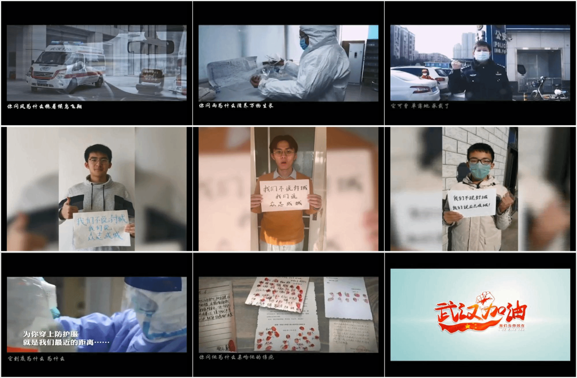 同学们用笔在纸上写下“我们不说封城,我们说众志成城”、“武汉加油,中国加油”等暖心文字,拍摄照片上传投稿,院员工会宣传部工作人员从央视网、央视新闻、共青团中央等线上平台广泛收集新闻素材和感人事迹,选取歌手毛不易的《无问》为背景音乐,结合同学们的投稿照片,制作完成了《期盼黎明,致敬英雄》战疫专题祝福视频。视频中真实还原了一线工作人员不惧艰难险阻牢守一线的奔波身影,反映了从病患到医护人员坚定乐观积极向上的抗疫态度。在视频的末尾,公司同学送上了诚挚的祝福,表达了物光青年对抗疫一线医护人员及患者朋友的祝福、鼓励以及打赢疫情防控阻击战的坚定信念。