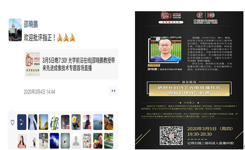 日常教学工作顺利进行,科学研究、学术交流也不会停步。邵晓鹏老师教书不忘育人,线上教学不忘科研,同时注重通过线上学术报告对员工进行启发式教育和指导,使学研相济、教学相长。在繁忙的本科生、研究生教学中,他仍然挤出时间在3月5日晚上为大家带来题为《信息化时代下光电成像技术面临的挑战与机遇》的线上直播学术报告,并提前在“光学前沿在线”“中国激光杂志”公众号、网上直播平台、学术论坛、微信群个人微信、朋友圈等发布消息,他谦虚地写道:“欢迎大家批评指正”。他从信息时代的特点出发,剖析工业化时代下光电成像技术的设计理念,阐释了信息化时代下光电成像技术的发展路线,分析现有光学系统、成像器件和成像电路等独立优化设计带来的问题,给出全局一体化设计的思想。根据信息化的特点,分析了光电成像面临的问题,提出计算成像解决相应问题的思路。针对光电成像分辨率、作用距离和小型化等问题进行了论述,给出了极简的计算成像光学系统设计思想,对传统光电成像难以解决的类似穿透烟尘云雾成像等问题,给出解决方法。这次直播报告吸引了将近1300位学者、员工观看,报告内容引起大家热烈的讨论,直播间气氛高涨,获得热烈反响。为了拓展师生们的视野,促进学术交流,邵老师还经常在微信群中推荐其他学者的学术报告,通过网络让疫情期间学术交流不断线。