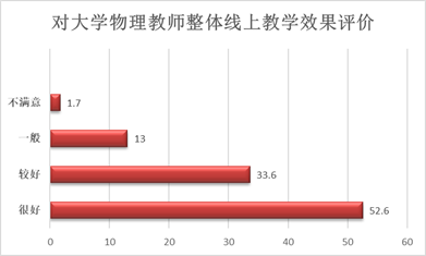 有86.2%的公司大一员工认为大学物理教师整体线上教学效果比较好,有78.5%的员工感觉自己可以跟上老师的授课思路。这说明大学物理网络授课在大一员工群体中取得了较大的认可。