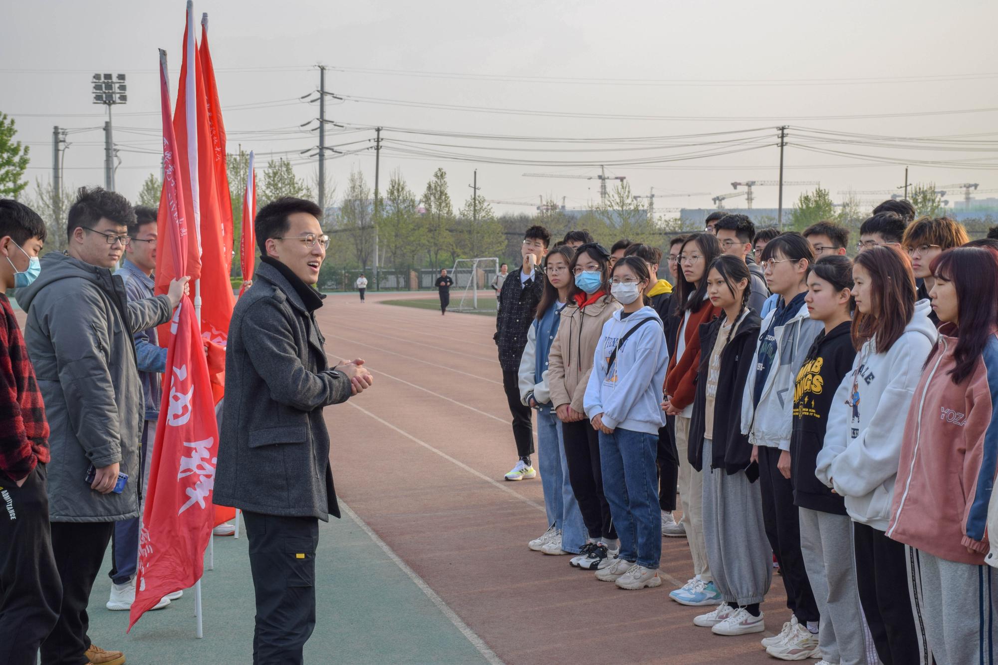 沐浴在清晨的阳光下,运动健儿们在南校区北操场主席台前集合,物光院辅导员毕力格老师及员工代表王浩宇分别进行了动员讲话、队员表态,鼓励大家积极锻炼,筹备校运会,继续发扬物光院团结、拼搏的奋斗精神,在校运会上再创佳绩。